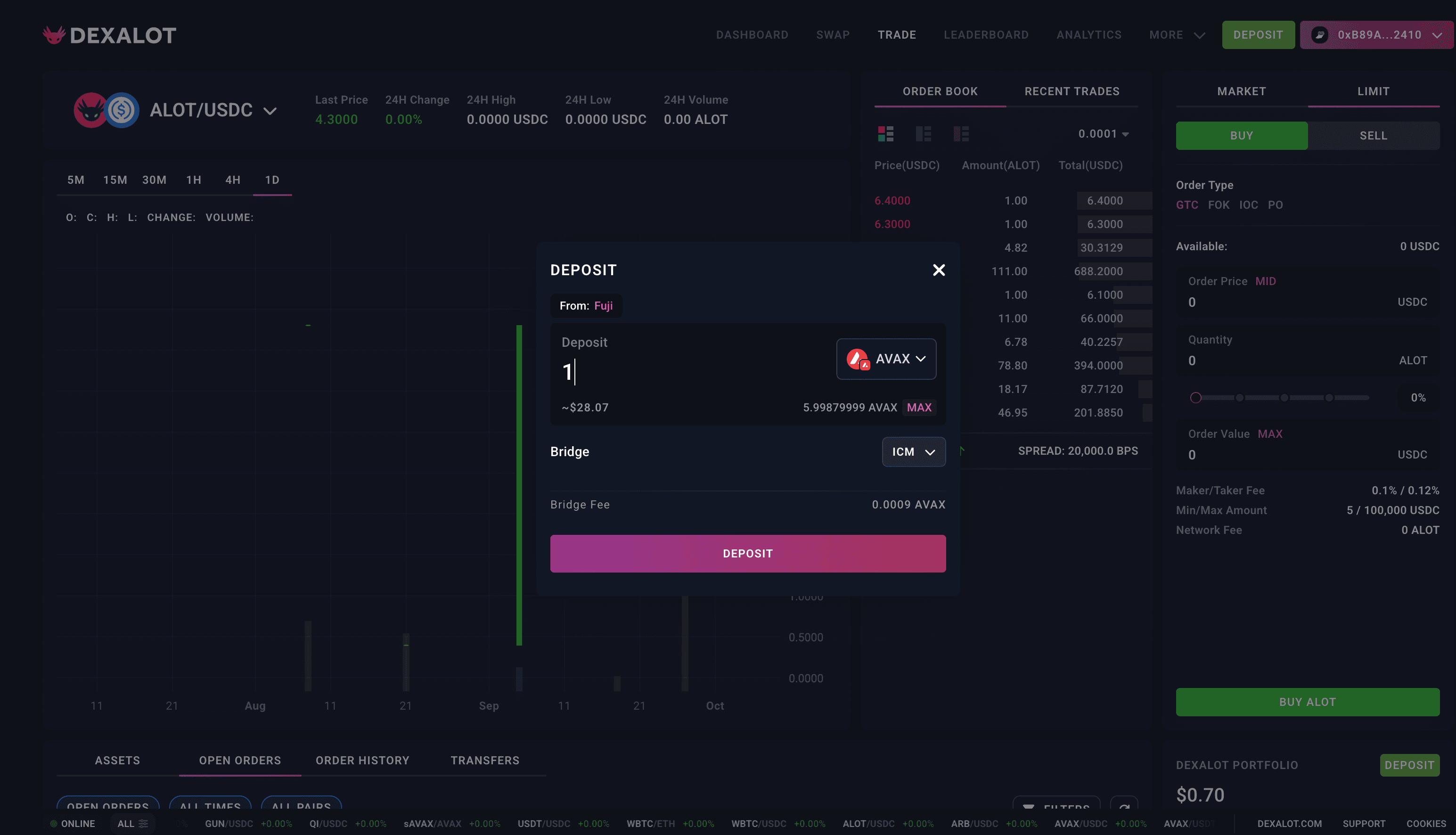 Once you clicked the Deposit button, select to deposit into the Dexalot L1. Enter 1 AVAX and click Deposit. Confirm the transaction in your wallet.