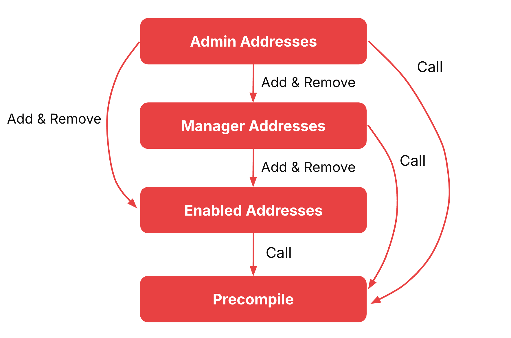 The Native Minter Precompile allows for fine-grained permissioning which address can mint more native tokens. There can be rich permissioning structures around precompiles with three roles.